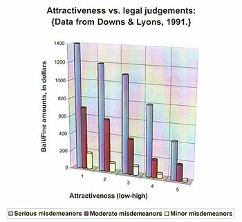 The judicial arena is not immune to the biases when it comes to physical attraction. In a classic experiment Michael Efran (1974) surveyed University of Toronto students about the relationship between presumption of guilt and attractiveness; they emphatically exclaimed physical attraction should not affect the assumption of guilt. Nonetheless, after Efran interrogated different students with a photographs of both an attractive and an unattractive party, they determined the most attractive defendant was least guilty. Correspondingly, they advocated the lowest levels of punishment for that person, as shown in the graph below.